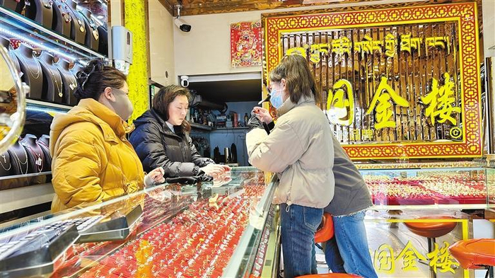 消费者在拉萨市某金银珠宝店挑选饰品。