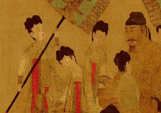 伟大的时代需要有伟大的图像记录和表现。《步辇图》是以贞观十五年(公元641年)吐蕃首领松赞干布与文成公主联姻的历史事件为题材,描绘唐太宗接见来迎娶文成公主的吐蕃使臣禄东赞的情景。这一重大历史事件,除了史料文献的记载外,就是这幅《步辇图》了。阎立本在选择用绘画记录这一历史事件的时候,只剪取了唐太宗乘坐步辇接见来使禄东赞这一特定场面来描绘,传神地刻画了4男9女共13位人物,借以反映这一历史事件。