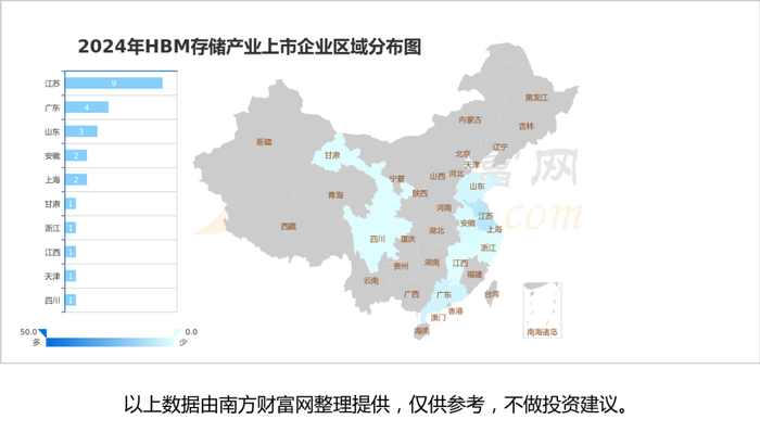 从上市企业分布情况来看,A股25家HBM存储相关上市企业分布在江苏、广东、山东、上海、安徽等省市,总体来看企业主要集中于华东区域。