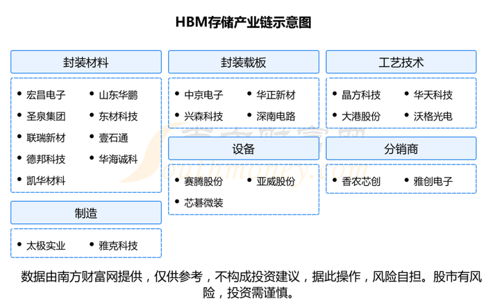 HBM存储产业链包含封装材料、封装载板、工艺技术、制造、设备、分销商等环节。封装材料公司主要包括宏昌电子、山东华鹏、圣泉集团、东材科技、联瑞新材、壹石通、德邦科技、华海诚科等;封装载板公司主要包括中京电子、华正新材、兴森科技、深南电路;工艺技术公司主要包括晶方科技、华天科技、大港股份、沃格光电;制造公司主要包括太极实业、雅克科技;设备公司主要包括赛腾股份、亚威股份、芯碁微装;分销商公司主要包括香农芯创、雅创电子。