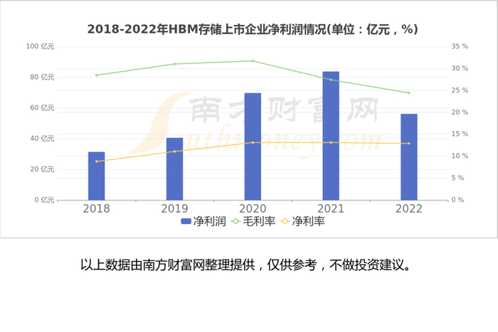南方财富网趋势选股系统数据显示,2022年A股25家HBM存储相关上市公司总体归母净利润为56.12亿元,同比减少32.96%,低于2021年水平。从HBM存储行业利润率来看,2022年平均毛利率24.41%,较2021年有所下滑,平均净利率12.88%,较2021年有所下滑。