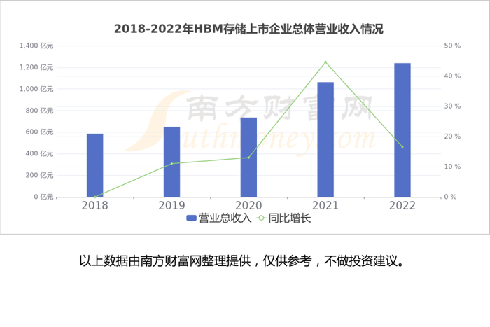 根据南方财富网趋势选股系统数据统计,A股HBM存储相关上市企业目前数量有25家,2022年总体营业收入约为1239.29亿元,同比增加16.55%。HBM存储上市公司2018至2023年总体营业收入情况如下: