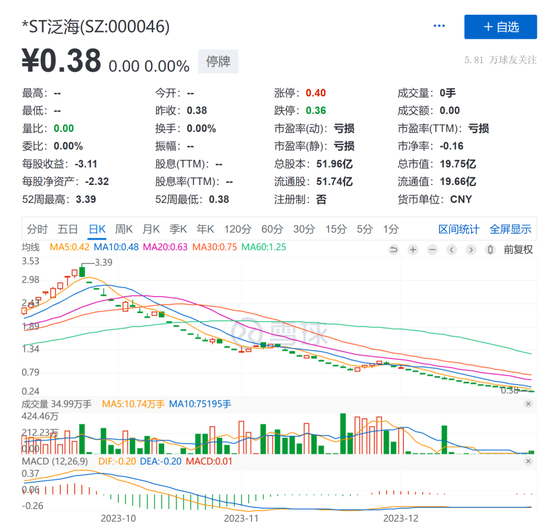 *ST泛海此前曾连收18个跌停板,股价锁定在0.38元/股,总市值19.75亿元。