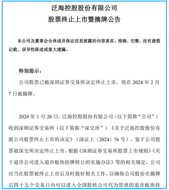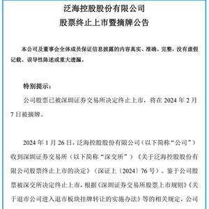 根据*ST泛海(000046) 6日晚间公告,由于连续二十个交易日的每日收盘价均低于1元,触及了终止上市情形,交易所决定其2月7日摘牌。