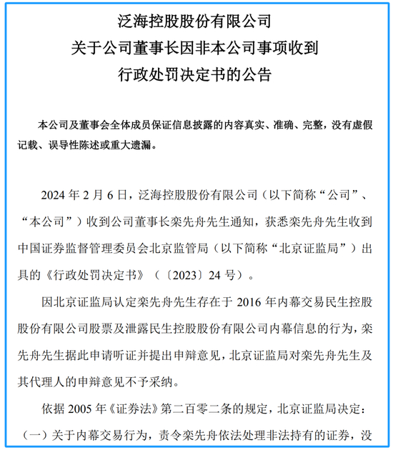 *ST泛海近日负面新闻不断。2月6日,*ST泛海收到公司董事长栾先舟通知,栾先舟收到北京证监局出具的《行政处罚决定书》(〔2023〕24号)。因北京证监局认定栾先舟存在于2016年内幕交易民生控股股票及泄露民生控股内幕信息的行为,栾先舟据此申请听证并提出申辩意见,北京证监局对栾先舟及其代理人的申辩意见不予采纳。依据相关规定,北京证监局决定,因内幕交易行为,责令栾先舟依法处理非法持有的证券,没收违法所得563.77万元,并处以违法所得三倍罚款;因泄露内幕信息行为,对栾先舟处以4万元的罚款。