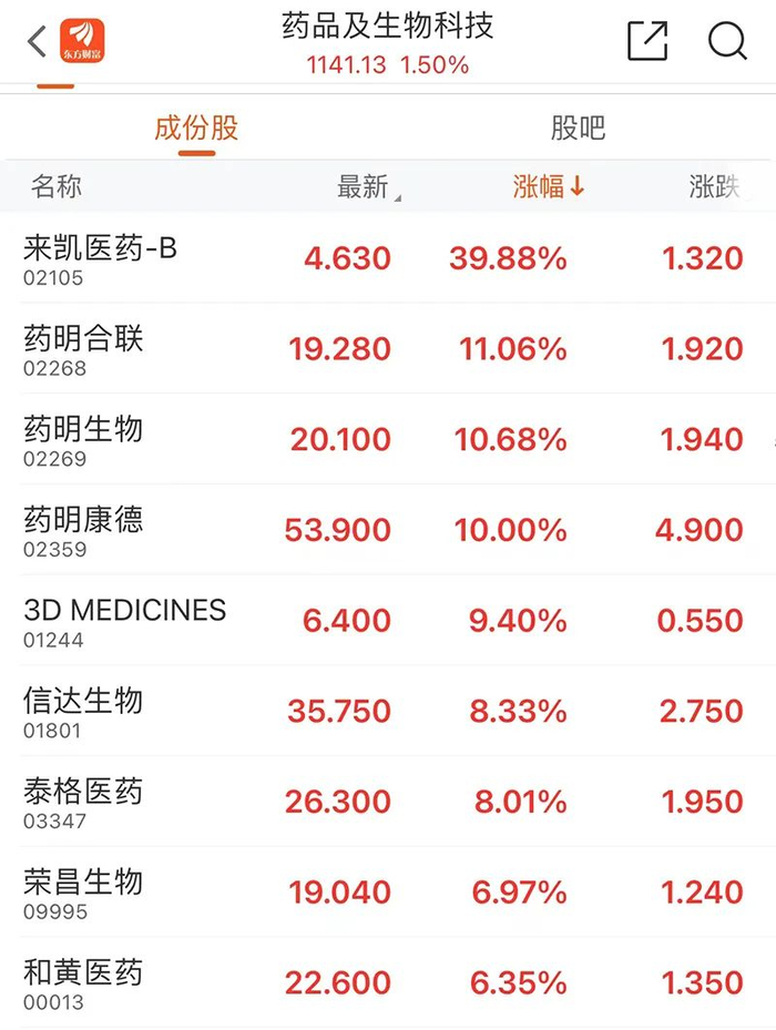 2月7日,港股CXO概念震荡拉升,药明系持续走强。截至发稿,药明合联涨超11%,药明生物涨近11%,药明康德涨10%。其他生物医药股中,来凯医药-B涨39.88%,泰格医药涨8.01%,荣昌生物涨6.97%,信达生物涨8.33%。