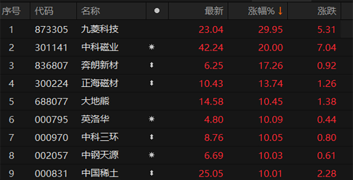早盘,稀土永磁板块拉升。截至午间收盘,中科磁业20cm涨停,中国稀土2连板,广晟有色、英洛华等涨停。
