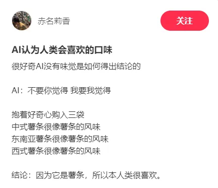 在无印良品官方小红书账号,AI薯条笔记的评论区,有消费者称尝出“牛排味”“烟熏味”。也有其他小红书用户尝出“西红柿鸡蛋”“水煮肉”“京酱肉丝”甚至“像折箩”(北京方言,指多种剩菜搅在一起),并吐槽“AI不要瞎研究人类口味了”。官方称进行了“3兆次”模拟,参考了多种食材,形成多样的口味也显得合乎模拟过程。