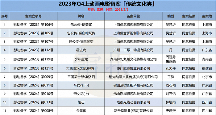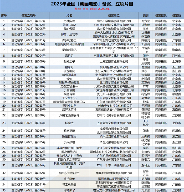 雷报也曾在2023年年内报道过Q1-Q2以及Q3的动画电影备案立项情况。1月30日,国家电影局发布了“关于2023年12月下全国电影剧本(梗概)备案、立项公示的通知”。至此,2023年电影备案立项片目已全部公布。