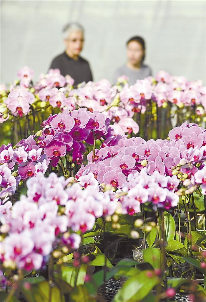 室外数九寒天,棚内却是温暖如春。步入棚内,数万株蝴蝶兰造型各异、竞相绽放,好似翩翩起舞的蝴蝶跃上细长的花枝,娇俏艳丽、美不胜收。不少市民、游客前来选购鲜花装扮家居,为节日增添喜庆气氛。工人们则忙着给蝴蝶兰喷水、定型、组盆、包装,供应春节节日市场。