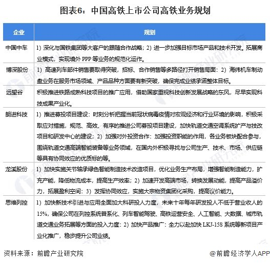 各大高铁列车及相关设备制造上市公司基于“十四五”规划制定较为详尽的高铁业务规划并贯彻执行。其中,中国中车、龙溪股份、铁科轨道、晋亿实业等公司主要从拓宽合作关系、加强市场及产品开发的角度做出业务规划;晋西车轴、铁科轨道对未来的产量做出规划;思维列控、中国中车等公司表示将继续加大技术投入。具体业务规划如下: