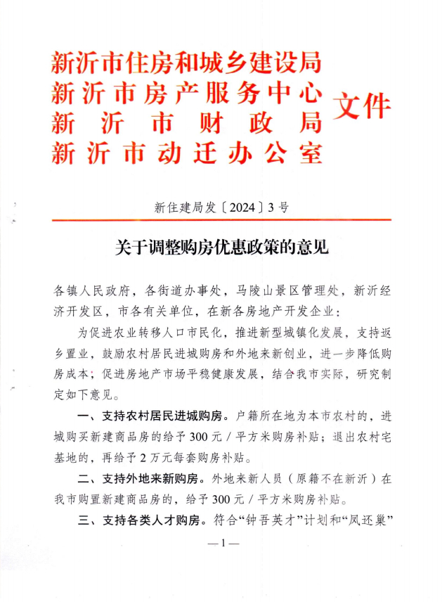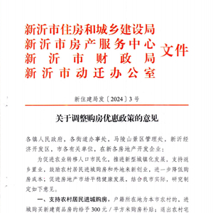 2月6日,江苏省新沂市房产服务中心等四部门发布《关于调整购房优惠政策的意见》,涉及农村居民进城购房、外地来新购房、各类人才购房给予购房补贴,购买商业用房给予契税补贴等9项措施。