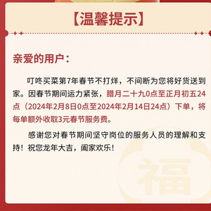 叮咚买菜提到,腊月二十九0点至正月初五24点(2024年2月8日0点至2024年2月14日24点)点单,每单将额外收取3元春节服务费。这也是该平台第7年在春节期间进行配送。