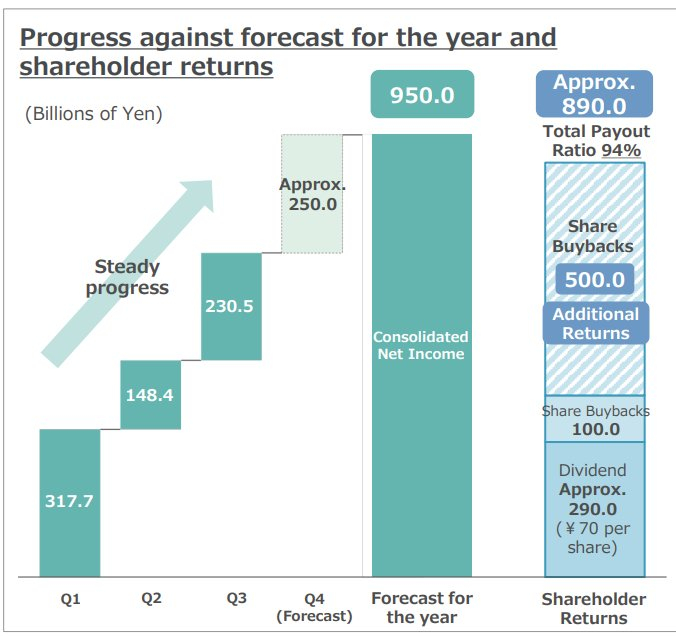 公司在报告中写到,由于各部门盈利稳定,本财年前9个月(截至去年12月31日)的利润达到6966亿日元,创历史第二高,仅次于前一年。而本财年利润之所以同比下降,是由于前一年俄乌冲突导致资源价格飙升。