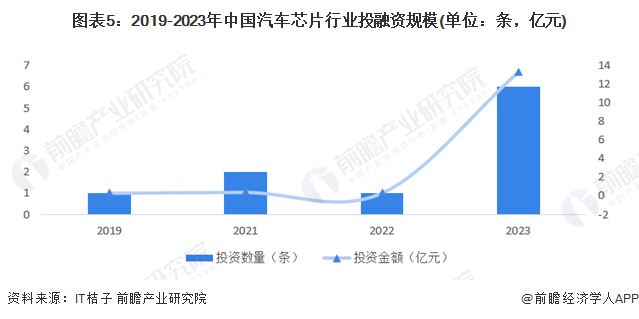 IT桔子数据显示,2019-2023年,我国汽车芯片行业投融资数量呈现逐渐攀升的趋势。2023年为我国汽车芯片行业的投融资热度高涨,全年汽车芯片行业投资笔数为6条,投资金额为13.28亿元。