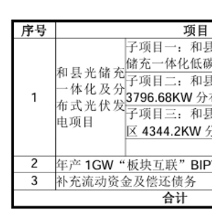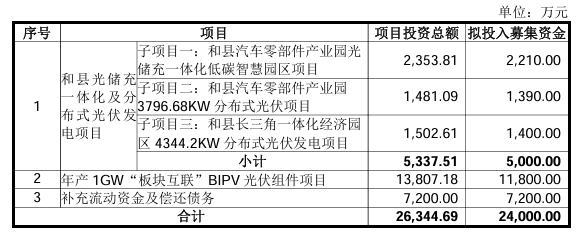 兆新股份 2024 年度以简易程序向特定对象发行A股股票募集资金使用可行性分析报告本项目投资总额 5,337.51 万元,拟使用募集资金 5,000.00 万元。包括 3 个子项目,分别为:和县 汽车零部件 产业园光储充一体化低碳智慧园区项目、和县汽车零部件产业园 3796.68KW 分布式光伏项目与和县 长三角一体化 经济园区4344.2KW分布式光伏发电项目。