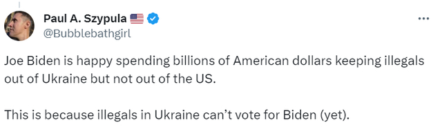 这幅漫画引发美国网友的讨论,一些人支持马斯克对拜登政府的批评。有人留言说,“乔·拜登乐意花费数十亿美元将非法入侵者挡在乌克兰之外,却不愿意将这种人挡在美国之外。这是因为在乌克兰的非法入侵者还不能投票给拜登。”