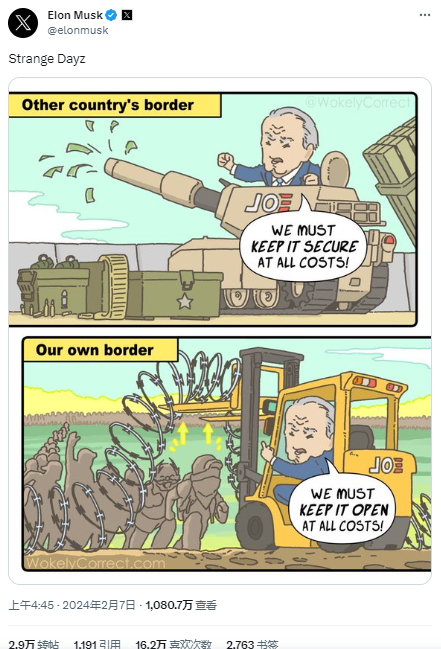 【环球网报道】近期,美国边境非法移民问题引发保守派的强烈抨击,舆论对立分裂愈演愈烈。美国富豪马斯克近日多次就该问题批评拜登政府。7日,马斯克又在社交媒体X上发了一幅讽刺漫画,抨击美国总统拜登在边境非法移民问题上的做法,引发网友热议。截至发稿,这条帖文已获得超千万浏览、16万点赞。