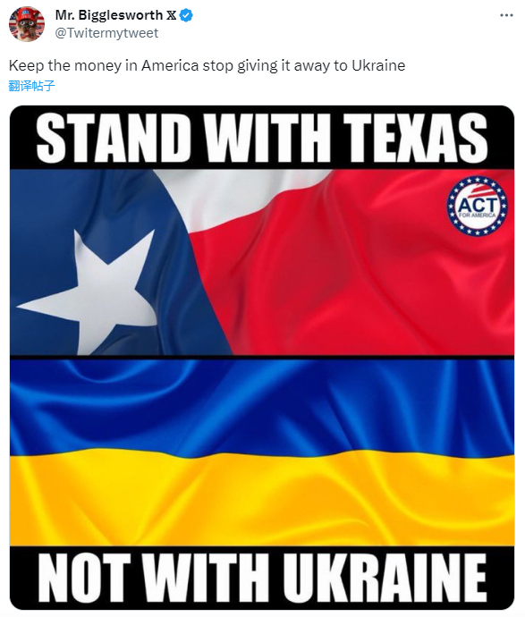 有人喊话:“把钱留在美国,停止把钱送给乌克兰!”其还配了一张图,上面有得克萨斯州和乌克兰的旗帜,并写着“与得州站在一起,而不是乌克兰”。