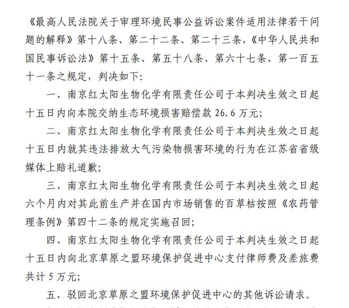 法院依据相关法律认定,红太阳公司违法排放大气污染物,导致生态环境受损,应承担赔偿损失、赔礼道歉的环境侵权责任。红太阳公司在百草枯被禁止在国内销售、使用后,未召回其生产的百草枯,对生态环境、生命安全构成重大风险,应承担召回产品以消除危险的环境侵权责任。