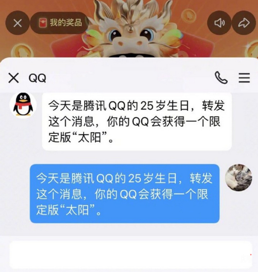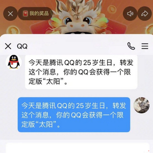 今天,不少网友的QQ聊天页面被这样一条消息刷屏:今天是腾讯QQ的25岁生日,转发这个消息,你的QQ会获得一个限定版“太阳”。