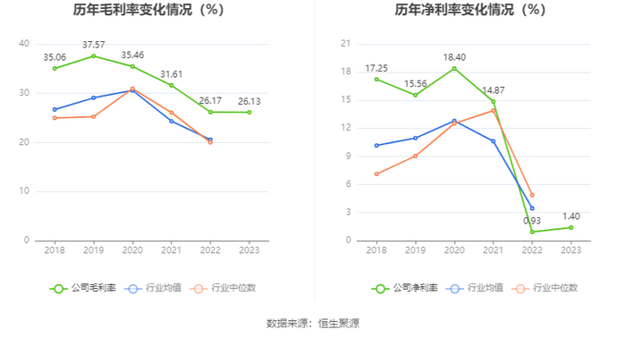 2023年,公司毛利率为26.13%,同比下降0.04个百分点;净利率为1.40%,较上年同期上升0.47个百分点。从单季度指标来看,2023年第四季度公司毛利率为30.04%,同比上升6.62个百分点,环比上升1.97个百分点;净利率为4.31%,较上年同期上升12.53个百分点,较上一季度上升1.06个百分点。