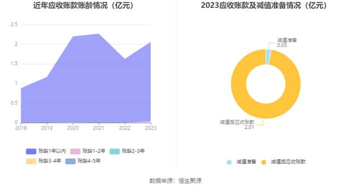 从应收账款账龄结构来看,截至2023年年末,公司账龄在1年以内的应收账款余额为2.02亿元,较上年末增长3928.80万元,占应收账款总额比例为98.09%,较上年末下降1.90个百分点。