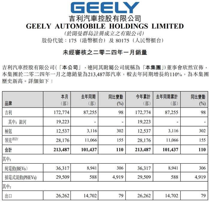 分品牌来看,1月,吉利品牌(含几何)销量为17.3万辆,同比增长98%,环比增长约61%;极氪交付1.3辆,同比增长超302%;领克销量2.8万辆,同比增长约155%,环比增长约10%。