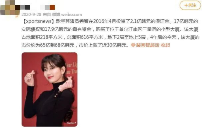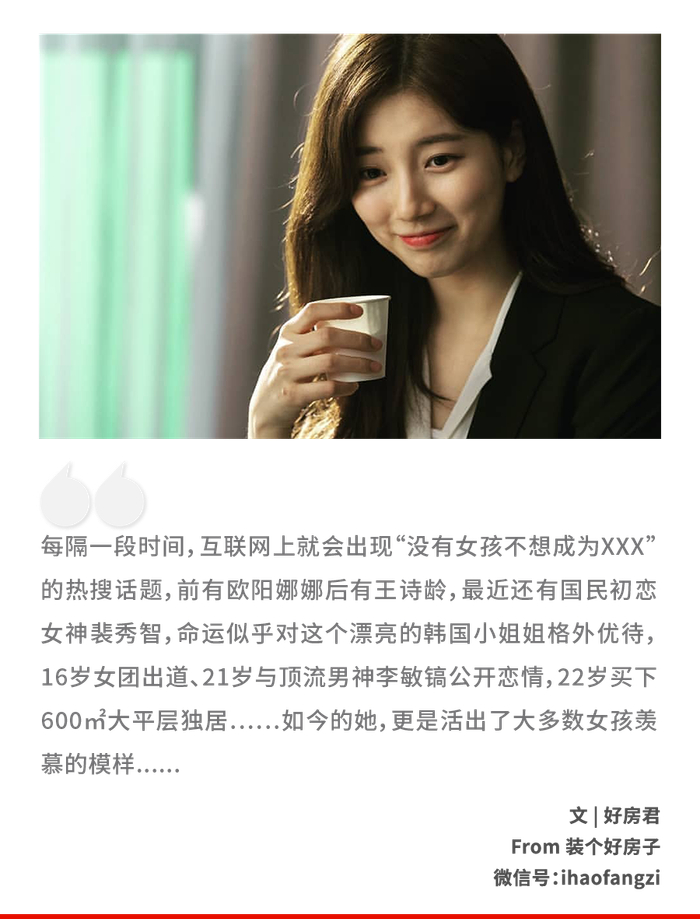 裴秀智在寸土寸金的江南富人区,为自己买了套价值50亿韩元、600㎡的豪宅,韩国网友还投票将她选为“住最贵豪宅的女爱豆第一名。”