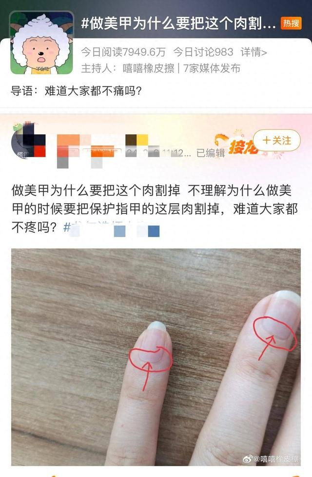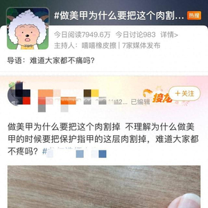 临近春节,不少爱美人士为指甲“穿上战衣”。然而美的背后,也可能给指甲带来不小的伤害。近日,一则关于“美甲”的话题引发热议,不少人疑问“做美甲为什么要把保护指甲的一层肉割掉”?不少美甲师称其实去掉的是一层死皮,不过体验不佳的网友表示,“剪多了就很痛”“被修到出血”。专家提醒,角质层可以适当修理,但为了漂亮过度修剪,不仅可能引起疼痛,真菌感染还可能引发甲沟炎、灰指甲等问题。