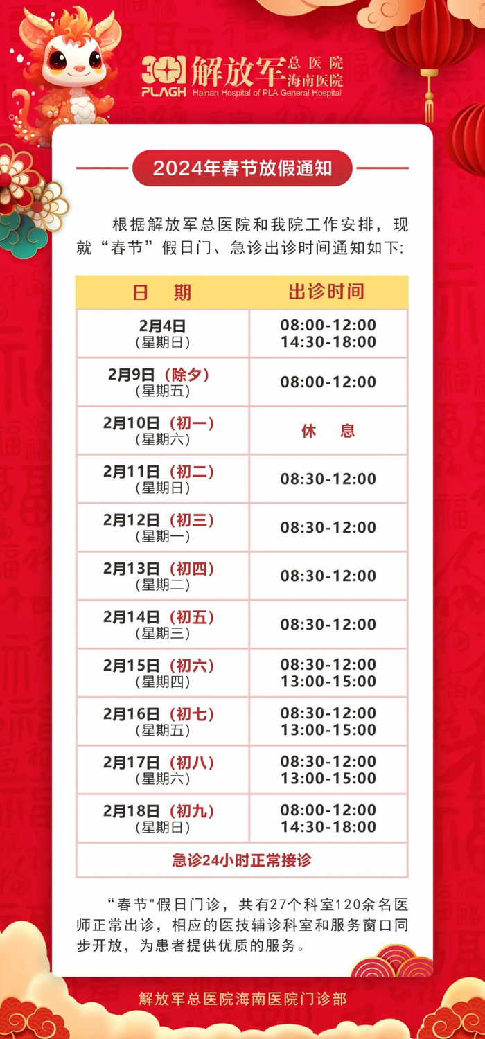海南省人民医院2024年春节期间门诊开诊安排:
