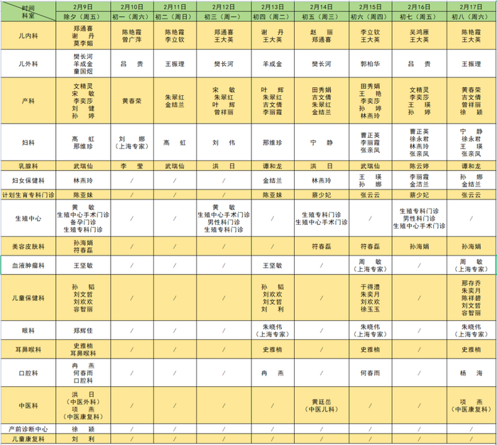 春节期间门急诊安排表出炉