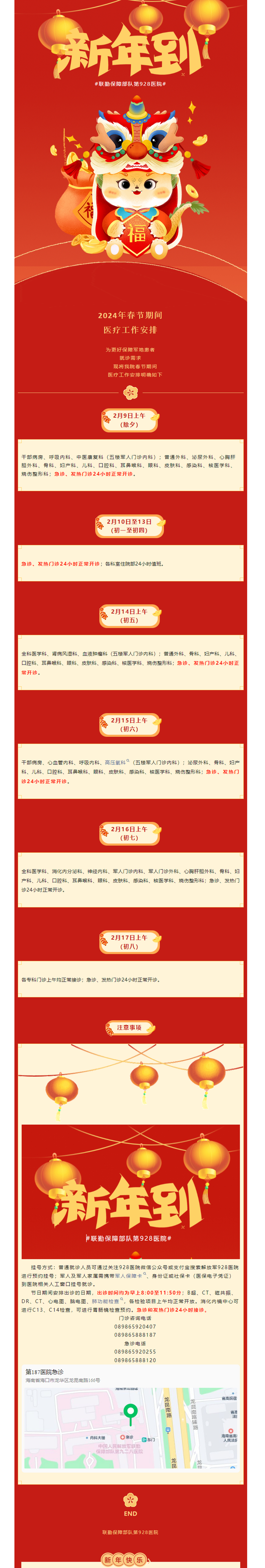 2024年春节期间,为更好保障军地患者就诊需求,第928医院春节期间医疗工作安排明确如下:
