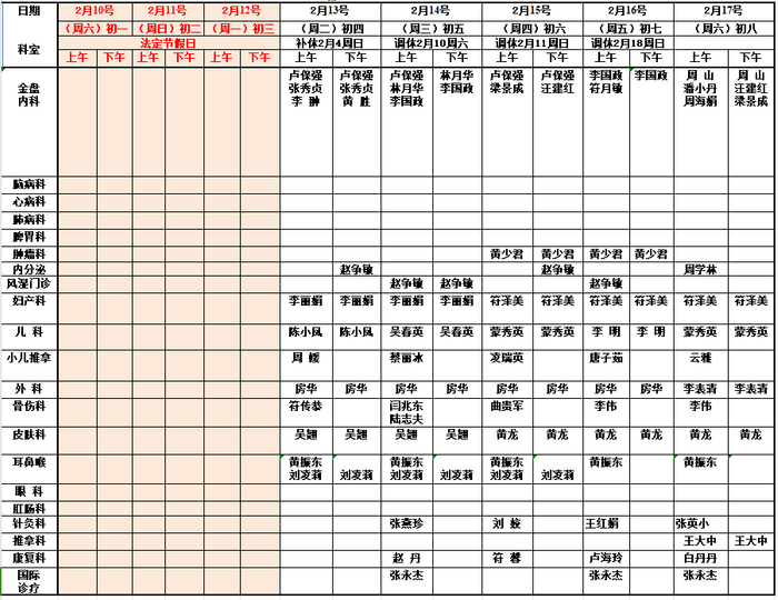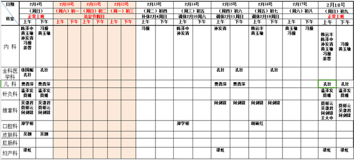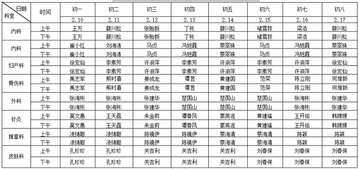 春节假期文明中门诊出诊安排表