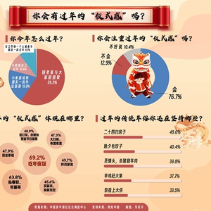 你还会坚持过年的传统习俗吗?你看重哪些过年的“仪式感”?上周,中国青年报社社会调查中心联合问卷网(wenjuan.com),对1333名青年进行的一项调查显示,94.1%的受访青年会坚持过年的传统习俗,76.7%的受访青年注重过年的“仪式感”,家人团聚吃年夜饭是受访青年认为过年“仪式感”最重要的体现。