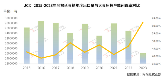从2023年12月开始,由于大豆供应逐渐枯竭,阿根廷多家大豆压榨企业计划暂停生产,不少大豆厂于2023年11月下旬就提前开始年度维护;一组数据就很能说明问题,截至2024年1月25日阿根廷油厂2022/23年度本土大豆累积采购量为1565.74万吨,远低于2023年同期的2802.89万吨,而2022年同期更是高达3006.8万吨。2023年阿根廷大豆压榨产能闲置率高达54%,如果没有进口大豆,压榨产能闲置率将高达70%左右,此外巴西在阿根廷大豆进口总量的份额从2022年的9%提高到2023年的39%。