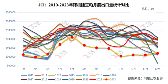 2023年1-12月阿根廷豆粕产量约1957万吨,较2022下降了近812万吨,同比降幅29.32%,同期,阿根廷豆油产量同比减少近220万吨,降幅为29.66%。2023年全年阿根廷豆粕出口总量为1621.29万吨,较2022年2507.23万吨下降885.93万吨或同比降幅35.34%,作为对比,2005年以来阿根廷豆粕年度出口量最高为2016年的2880.33万吨。