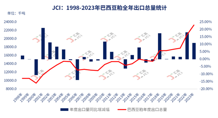 2022/23年度阿根廷大豆产量,因遭受连续三年拉尼娜带来的干旱天气重创而腰斩,也使得2023年阿根廷国内大豆压榨量创下19年来最低水平。2023年阿根廷豆粕供应匮乏,推动巴西豆粕大量出口。2023年在阿根廷豆粕出口大幅下滑35.34%的背景下,巴西豆粕出口增幅达到15.98%,我们在前面的文章中分析过,美国豆粕出口也因此受益,但巴西豆粕和美国豆粕出口总量仍难以弥补2022/23年度阿根廷豆粕出口供应出现的缺口。进入2024年,巴西大豆豆粕出口继续呈现反季节增长,由于巴西大豆基差价格近月来的暴跌行情,有未经证实的传言称阿根廷预订了几船巴西大豆,此举可能加快阿根廷豆粕和豆油进入世界市场,而通常阿根廷大豆会在4/5月间才收获上市。