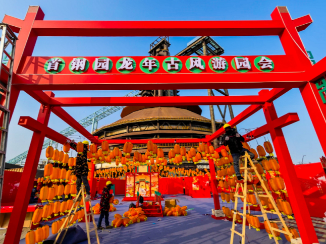 2月7日下午,位于三高炉南广场上,首钢“集”祥——龙年古风游园会已完成最后的展台搭建工作,一串串的大红灯笼高高悬挂,在春节期间的夜晚将点亮三高炉区域。