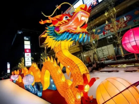 在槐房西路大悦春风里广场上,一座20米长的巨龙花灯,龙首高昂,龙鳞璀璨,在夜幕中绚烂夺目,和点缀在广场上的中国龙景观小品一起,呈现浓浓年味。