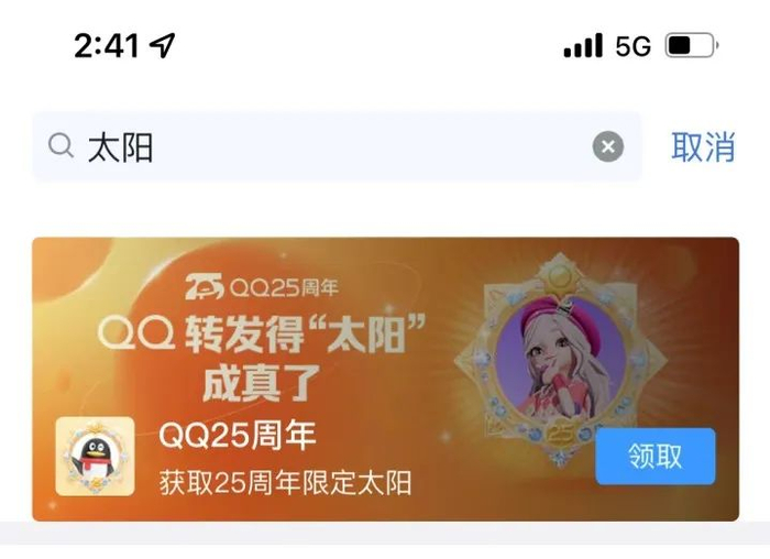 记者也赶紧登上很久不用的QQ领取了一波,直接在搜索框搜索“太阳”二字,就可以直接领取哦。