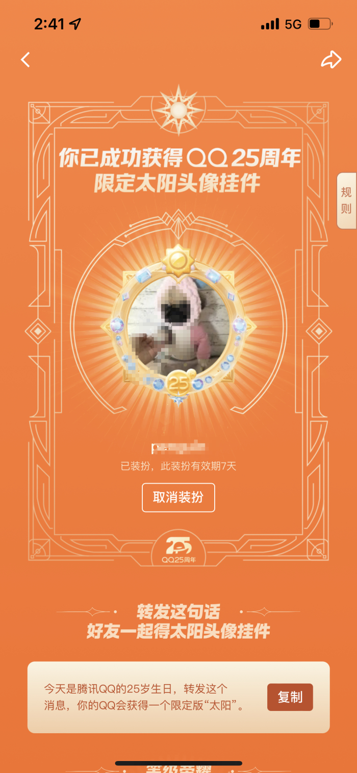 今天是腾讯QQ的25岁生日,转发这个消息,你的QQ会获得一个限定版“太阳”。