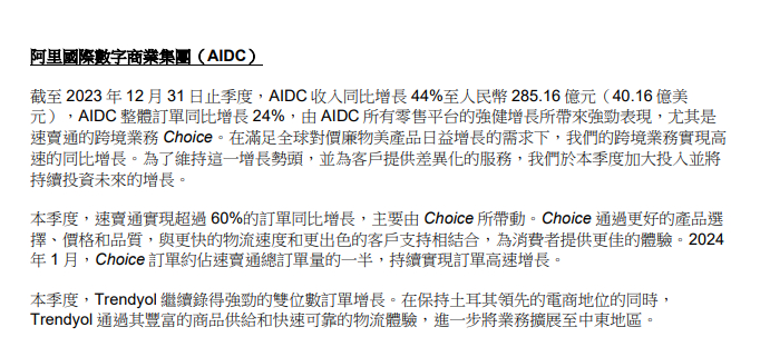 阿里国际数字商业集团该季度收入同比增长44%至285.16亿元,整体订单同比增长24%。财报称,在满足全球对物美价廉产品日益增长的需求下,跨境业务实现高速增长。为了维持这一增长势头,并为客户提供差异化服务,集团本季度加大相关投入。