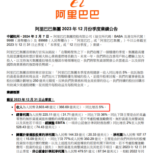2月7日晚间,阿里巴巴集团发布2024财年第三季度(即自然年2023年第四季度)业绩。