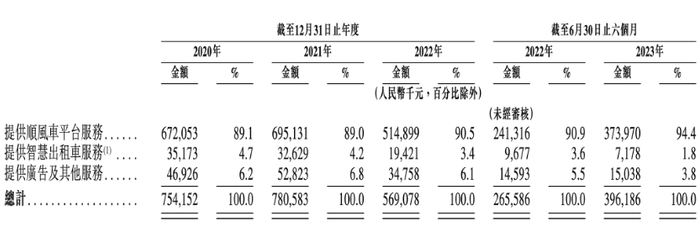 嘀嗒出行主营业务可以分为三部分,分别是顺风车、智慧出租车服务、广告服务。其中,嘀嗒出行主营业务为顺风车平台服务,收益主要来自向顺风车私家车主收取服务费,截至2023年6月30日,这一服务费的百分比为10%左右。