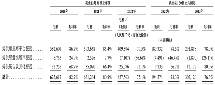 值得注意的是,嘀嗒出行的核心业务顺风车业务的毛利率也在一路下滑。自2020年到2022年分别为86.7%、85.4%、79.5%,2023年上半年则为78%。