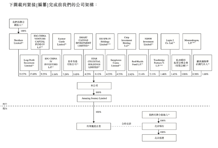 据招股书,嘀嗒出行在上市前的股权架构中,控股股东是5brothersLimited,持有公司33.57%的股份,并拥有公司50%的投票权。