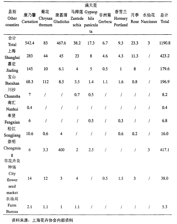 2000年上海郊区鲜切花主要品种、面积分布表(单位:亩)。