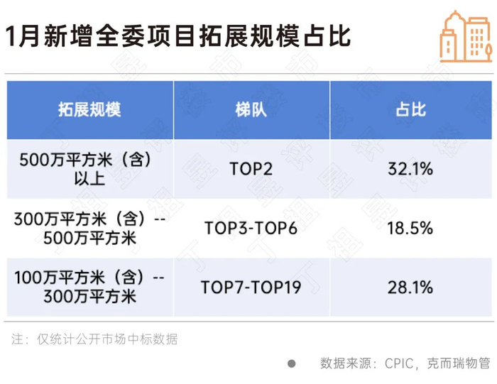 据克而瑞物管统计,2024年1月,50个企业共计新增第三方拓展规模8077万平方米。拓展全委托项目规模达到500万平方米仅2家企业,TOP 2拓展规模占比32.1%;新增拓展项目在300万平方米(含)-500万平方米之间的共有4家企业,拓展规模占比18.5%;新增拓展项目在100万平方米(含)-300万平方米之间的共有13家企业,拓展规模占比28.1%;拓展规模百万平方米及以下的占比21.3%。