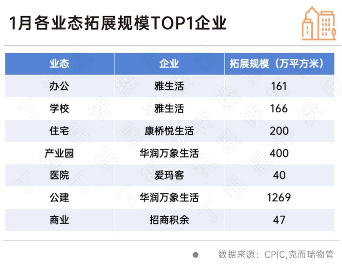 据克而瑞物管统计,越来越多的物业公司开始扩展非住宅业态,丰富服务领域,寻找新利润增长点,就监测数据来看,2024年1月第三方拓展规模前三的业态是公建、学校、住宅,其中公建及学校拓展规模占比近五成,明显高于其他业态。